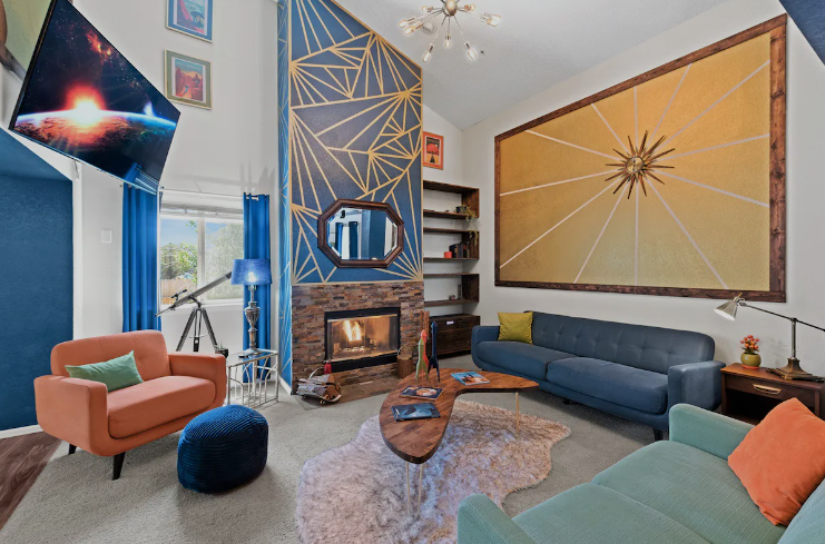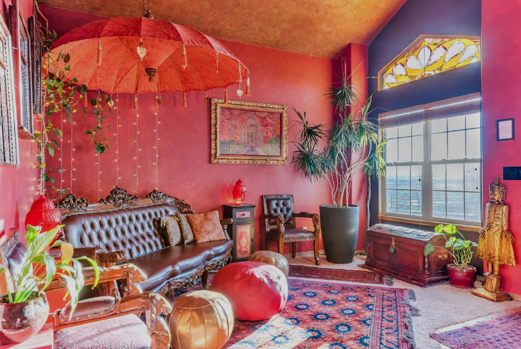 This unique Colorado Airbnb offers an Indiana Jones-style adventure within its decor. Guests love the Element House Treasure Hunt, a quest with 13 hidden clues throughout the home, promising hidden keys, challenges, and even possible treasure. The eclectic decor ranges from Middle Eastern tapestries and Khan weaponry to the fire-themed Victorian touches and elemental-themed bedrooms. Enjoy backyard relaxation or activities like meditation and axe throwing.