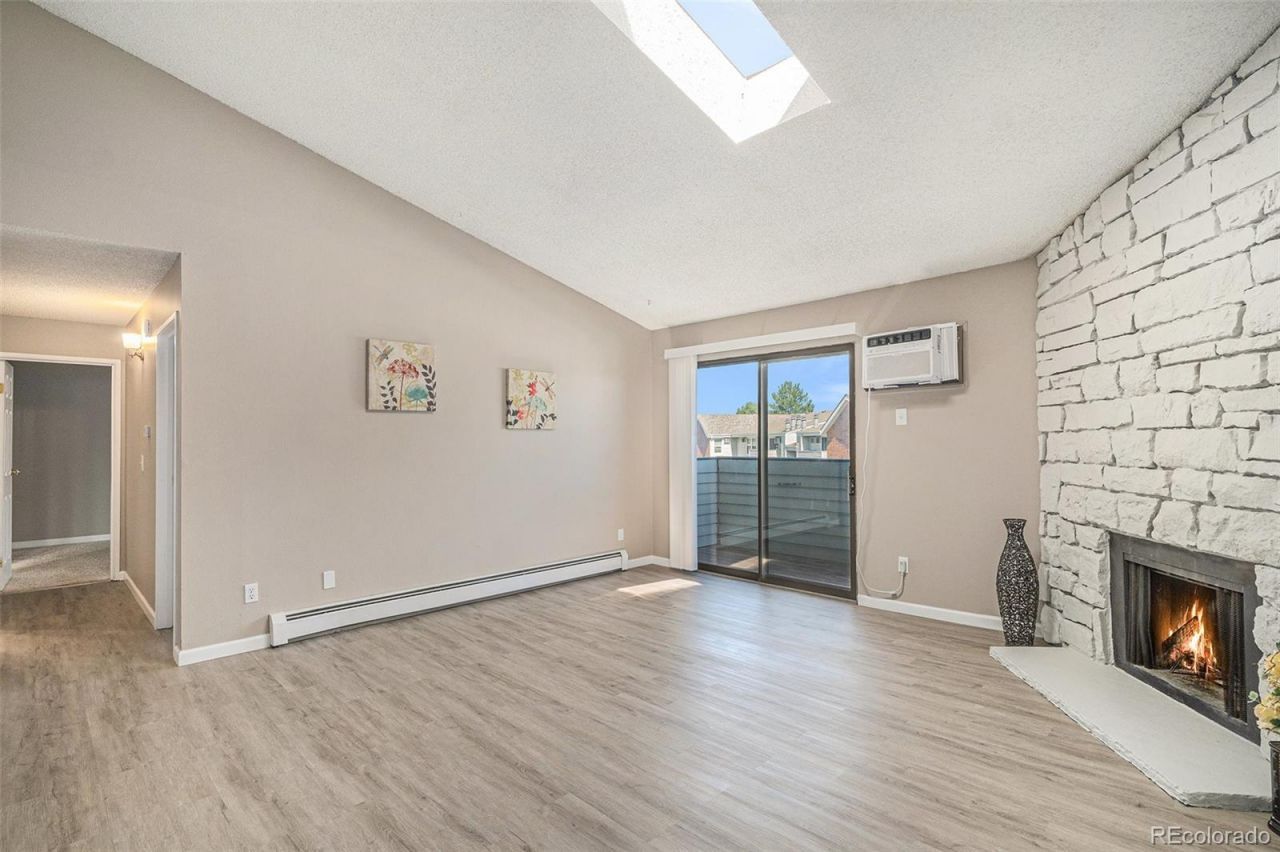 This condo has many great features, NEW carpet; All less than 1 year old: Granite kitchen counter tops, new luxury vinyl plank and carpet flooring and bathroom vanities! Welcome to Oak Park, a gated community tucked away in east Denver with everything you need?pool, clubhouse, walking paths, and even a playground and park right onsite. This move-in ready top-floor condo offers peace and privacy with no neighbors above you and a bright, open layout thanks to vaulted ceilings and a skylight that fills the space with natural light. This condo has many great features, all less than 1 year old: Granite kitchen counter tops, new luxury vinyl plank and carpet flooring and bathroom vanities!Step into a spacious living room featuring luxury vinyl plank flooring, a cozy wood-burning fireplace with whitewashed stone surround, and sliding glass doors that lead to your private balcony. Its the perfect spot for morning coffee or relaxing after work. The kitchen has granite countertops, all stainless appliances, and a convenient breakfast nook.The primary suite is oversized and freshly carpeted, complete with a walk-in closet and updated en-suite bathroom with new vanity and tiled tub surround. A second bedroom and full bath (also updated) offer flexibility for guests, roommates, or a home office. Full-size washer and dryer are included, tucked conveniently in-unit.This home also comes with a 1 car deeded detached garage?no scraping windows come winter?and the HOA fee covers heat, water, trash, and even building maintenance. Youll love the community pool and clubhouse, bbq (one is adjacent to this condo), playground, grass volleyball court and picnic areaDont miss the chance to live just minutes from Lowry, Cherry Creek, and major transit.