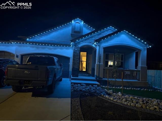 Beautifully maintained and spacious, this 5-bedroom, 4-bath, 1.5-story stucco home with a 3-car garage is ideally located in sought-after Meridian Ranch. Excellent curb appeal is enhanced by low-maintenance xeriscaping and a welcoming covered front porch. With 3,897 sq ft of thoughtfully designed living space, the bright, open main-level floor plan is perfect for entertaining and everyday living, complemented by central air and heat for year-round comfort. Just off the entry, a main-level bedroom with adjacent full bath offers flexibility for guests, an office, or nursery. The island kitchen features granite countertops, wood cabinetry, pantry, breakfast bar, and stainless appliances including a gas range, microwave, and dishwasher. The dining area opens to the backyard patio for seamless indoor-outdoor living. The great room showcases vaulted ceilings, ceiling fan, and a cozy gas fireplace with stone surround. The main-level primary suite is a private retreat with tray ceiling, ceiling fan, plush carpet, and barn door leading to a luxurious 5-piece bath with dual vanities, soaking tub, tiled shower, and walk-in closet. Convenient main-level laundry with washer/dryer and garage access adds functionality. Upstairs offers a versatile loft, additional bedroom, and full bath. The finished basement expands living options with a large family/rec room, two more bedrooms, and a full bath—ideal for guests or multi-generational living. Enjoy a fenced, low-maintenance backyard with xeriscaping, drip irrigation, artificial turf, and a spacious 26x14 patio perfect for entertaining. Additional features include a sump pump, covered window wells, and attached 3-car garage. Meridian Ranch residents enjoy exceptional amenities, including a community center, 500 acres of parks and trails, golf course, and two recreation centers with pools, lazy river, gym, indoor track, and daycare. This home truly has it all and is ready for you to make it your own!