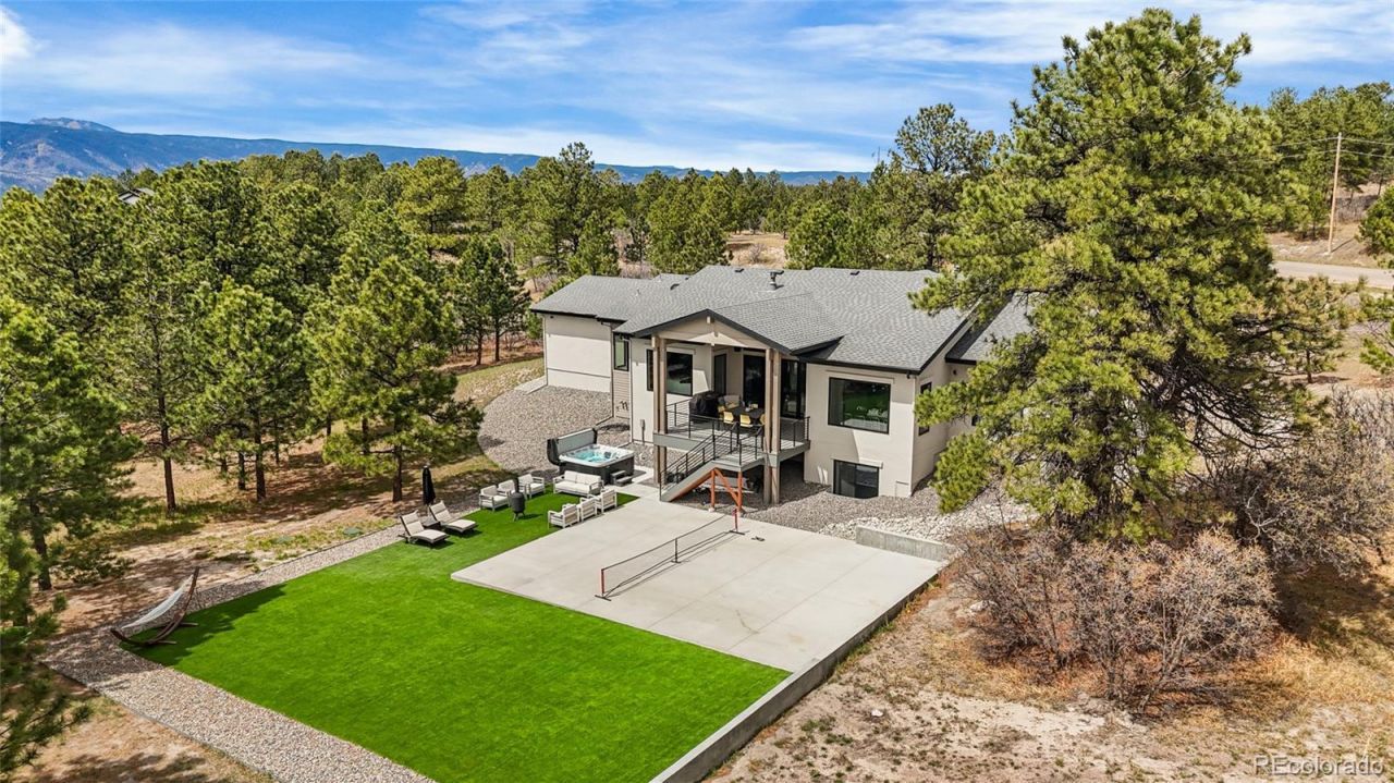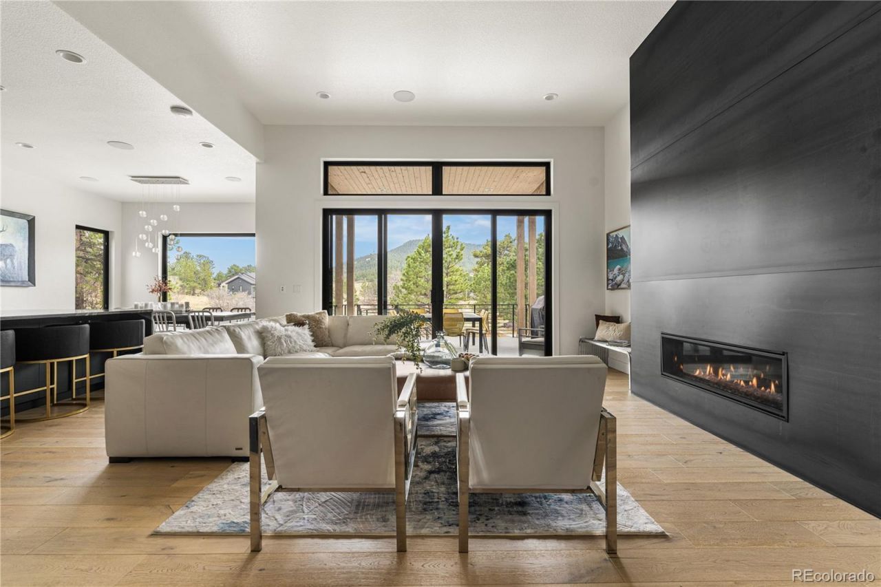 Experience the perfect blend of Colorados rugged beauty and modern sophistication on nearly five pristine acres in Larkspur. This custom-built estate offers a true mountain retreat lifestyle with easy access to Castle Rock, I-25, and the Front Range as well as Costco and a shopping center just 10 minutes up the road. Inside, 10-foot ceilings and curated lighting set a tone of effortless luxury. The expansive great room is anchored by a dramatic floor-to-ceiling cold-rolled steel fireplace, while oversized windows frame stunning Rocky Mountain views. The gourmet kitchen is designed for both performance and entertaining, featuring an 8-burner gas range, double wall ovens, built-in refrigerator, and premium finishes, all flowing seamlessly into the main living spaces. The primary suite offers a private retreat with a spa-inspired five-piece bath, a spacious walk-in closet, and direct access to the laundry room. The main level also includes a dedicated office and two additional bedrooms. The finished basement expands the homes footprint with media and gathering spaces, a home gym, sauna, private guest suite, and a large unfinished area ready for customization. Modern living is elevated with gig-speed fiber internet, whole-home wiring, mesh Wi-Fi, and a built-in sound system extending to the covered Trex deck. Unlike typical mountain properties, this nearly 5-acre lot is remarkably flat, offering rare usability for outdoor living, events, or recreation. Enjoy low-maintenance turf, professional xeriscaping, and a private hot tub perfect for stargazing. A rare opportunity to own a legacy property that delivers luxury, privacy, and convenience without compromise.