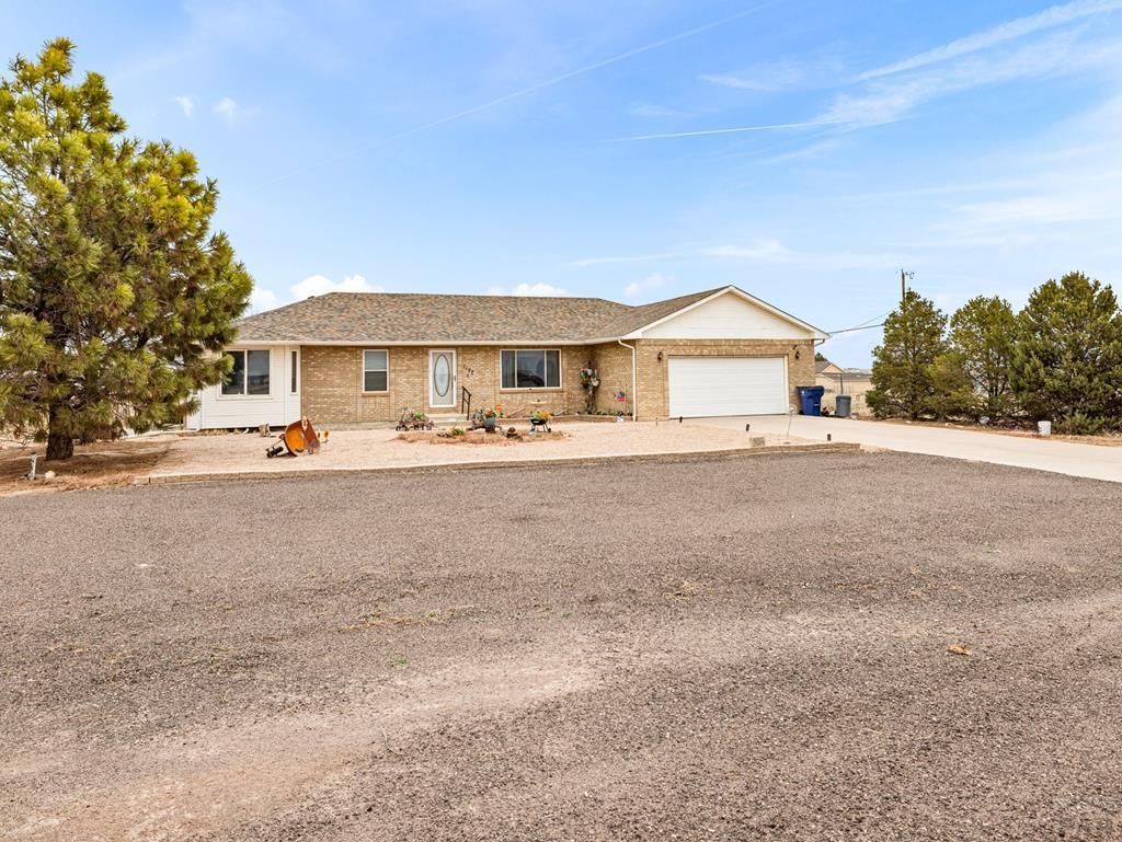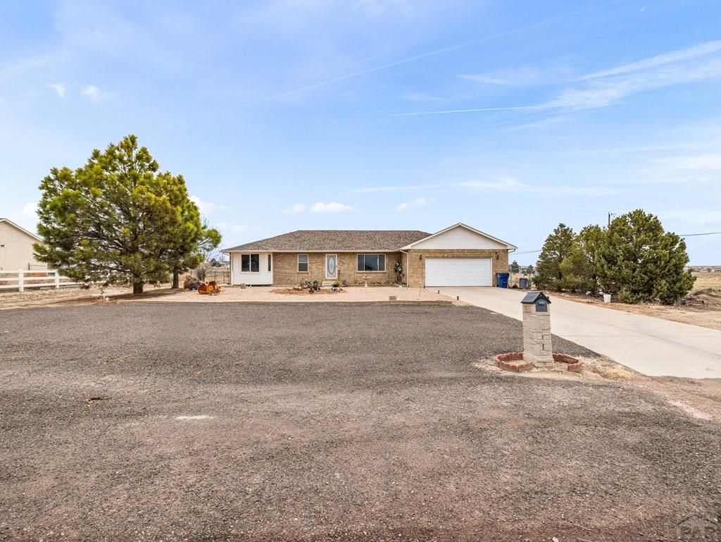 MOTIVATED SELLER!! Welcome to this inviting brick ranch style home offering a perfect blend of comfort & functionality. Step inside to a bright and open living room featuring brand new carpet, vaulted ceilings, fresh paint & a large picture window that fills the space with natural light. The kitchen & dining area flow seamlessly together and feature tile flooring, new paint & include all appliances for your convenience. The main level hosts three comfortable bedrooms, each with carpet and ceiling fans for year round comfort. The primary suite offers a walk-in closet, new carpet, new paint, private en suite bathroom with a tub/shower combo, & direct access to the backyard patio for a perfect retreat for relaxing evenings. The mostly finished basement expands your living space with a large rec room, dedicated storage area, dimmer lighting, and surround sound wiring, plumbing for an additional bathroom. There is also potential to add another bedroom, making this space ideal for guests or hobbies. Step outside to enjoy a concrete patio with built-in speakers, partial fencing, and a designated dog pen, chicken run or garden area. Solar panels provide energy efficiency, while recent updates include a new water heater (May 2025) and a roof and gutters approx. 5 years old. Additional features include central ac, storage, 3-car tandem garage, and a new septic system before closing. Home is just minutes from I-25 and Fort Carson. Pool table & Sauna are negotiable.Move in Ready!
