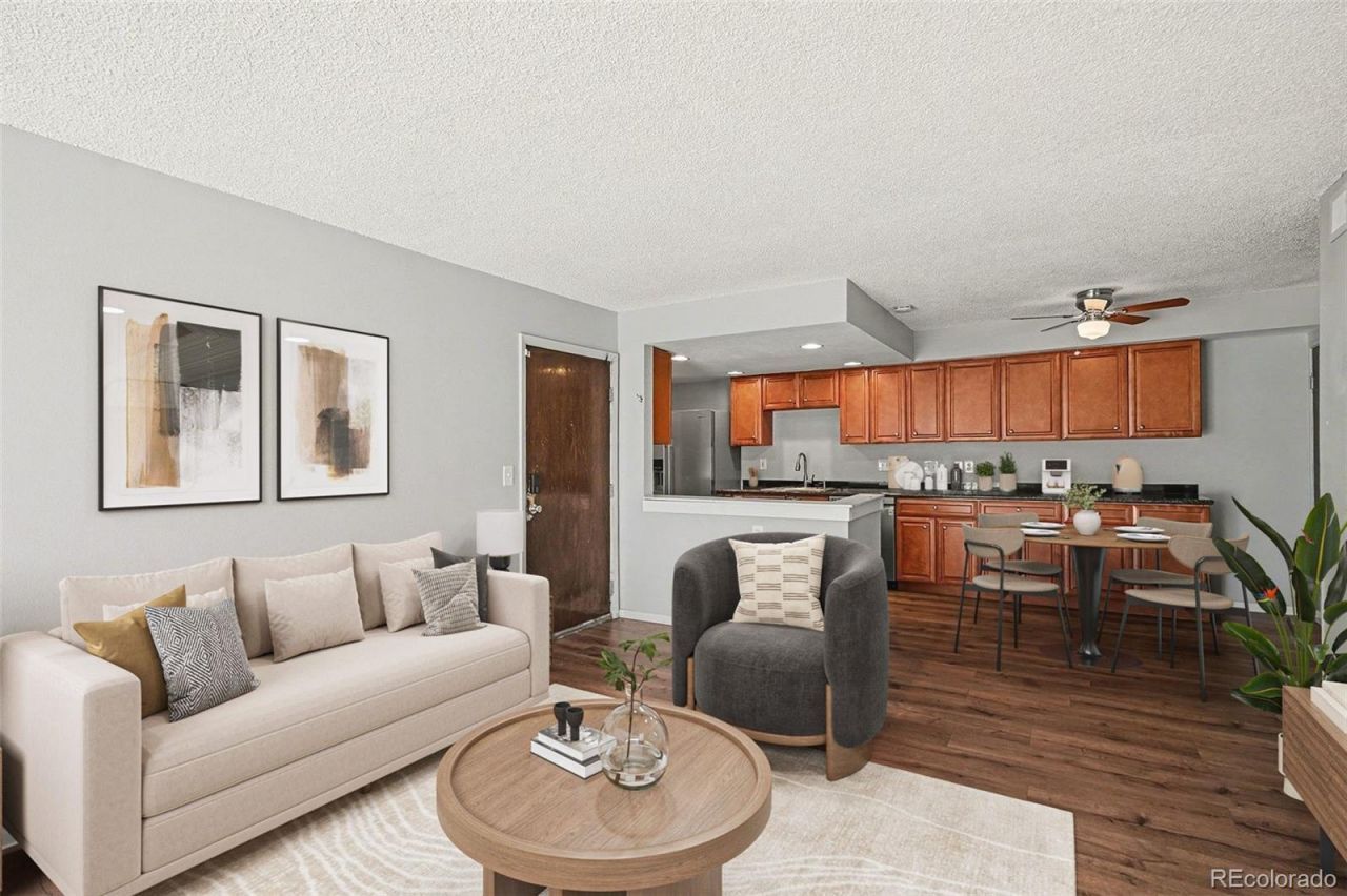 Centrally located and thoughtfully updated, this main-floor turnkey condo in Auroras Brandychase community offers zero-maintenance living in nearly 1,000 sqft, welcome home to 14142 E Colorado Drive. Beautiful new laminate hardwood floors and fresh interior paint (both completed in 2024) greet you upon entry and complement the spacious open living area. Abundant natural light fills the room from the large sliding glass door, easily welcoming the outdoors in. Cozy up by the wood-burning fireplace on cool Colorado evenings or enjoy sipping your morning coffee on the covered patio in the warmer months to come. The updated eat-in kitchen features both butcher-block and granite countertops, ample wood cabinetry, and a pantry. Brand new carpet (2025) extends into two generously sized bedrooms. The primary is complete with dual closets and an ensuite updated bathroom. Additional features of this property include a hew HVAC (2025), in-unit laundry (newer, included), and both a detached garage and 1 reserved parking spot. HOA includes a community pool, sports courts, a park, and a playground. Ideally situated within minutes of shopping, dining, public transportation, the Anschutz campus, and major roadways, this property delivers comfort, style, and an ideal location.