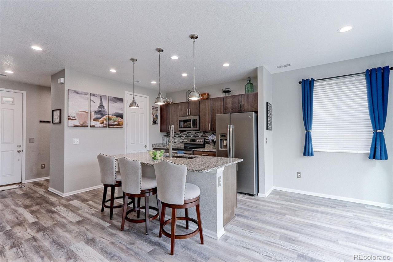 Fantastic opportunity to live in the highly desirable Traditions community! This beautifully upgraded 3-bedroom, 3-bath Richmond American Coral model is ideally located near the large park, playground, basketball court, and skate park. Enjoy incredible HOA amenities including a community pool, clubhouse, parks, trails, plus trash and recycling services.The main floor features an open-concept layout with a spacious living room, dining area, powder bath, and a stunning kitchen complete with granite countertops, glass tile backsplash, upgraded faucet, pendant lighting, pantry, and a large island with seating?perfect for entertaining. The dining area offers abundant natural light through an oversized sliding glass door that leads to the expanded patio, ideal for outdoor dining and relaxation.Upstairs, youll find a versatile loft that could easily be converted into a 4th bedroom, two additional bedrooms, a full hall bath, convenient laundry room, and a spacious primary suite. The primary retreat includes a walk-in closet, dual sinks with upgraded counter height, and a walk-in shower. All bedrooms feature upgraded ceiling fans, and the home is pre-wired for surround sound.Additional highlights include a custom dog run with low-maintenance astroturf, radon mitigation system, water softener, and all appliances included.Conveniently located with easy access to I-70, E-470, Buckley AFB, DIA, schools, parks, and Southlands Mall?this home truly has it all!