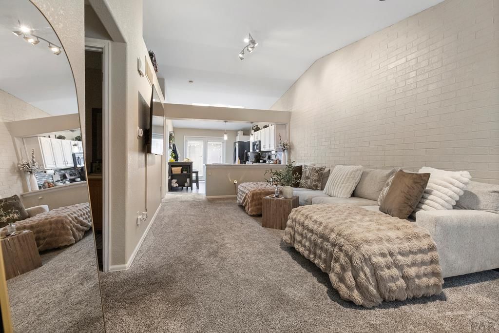 Experience refined living in this impeccably UPDATED single level, brick Townhome. Tucked inside the beautifully landscaped, HOA-maintained grounds. In a highly sought-after location, with stunning front landscaping, & Surfwood Ln. frontage. These units rarely go up for sale (especially in this condition.) Step inside a thoughtfully designed layout enhanced by vaulted ceilings, fresh interior paint, & newer carpet that complement the home's spacious, light-filled atmosphere. The showstopping kitchen is a true centerpiece. Featuring newer stainless-steel appliances, epoxy counters, stunning mosaic tile back-splash, composite granite sink, refinished cabinetry, & contemporary lighting. Both bathrooms have been tastefully updated. While newer flooring throughout & a brand-new hot water heater ensure peace of mind and lasting comfort. Stepping outside to your private brick courtyard oasis, adorned with charming string lighting. What an inviting retreat for intimate gatherings or quiet evenings under the stars. The over-sized 2 car garage has a rare additional attached storage room for all of your storage needs. Meticulously maintained and beautifully updated, this residence offers an elevated lifestyle that blends convenience, security, with worry-free exterior care. All packaged in one of the Pueblo's most desirable maintenance free communities. Conveniently located, just minutes from a quick bite to eat, schools, shops, the library, and I-25. This one is ready for YOU!