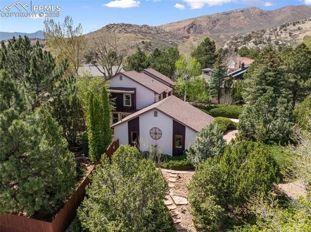 LOCATION & VIEWS!*ROOF 2019*PASSIVE SOLAR HEAT*470 SQ FT GARAGE W/WORKSHOP*LARGE DECK PERFECT FOR A HOT TUB*Welcome to your very own private oasis! Originally built as the model home for this highly coveted Mountain Shadows community, you'll be amazed how much privacy abounds on this 1/4+ acre corner lot w/a curved driveway & countless mature trees that have been maintained by a professional arborist. From the moment you arrive to this stunning property, you'll have difficulty deciding if your days will be spent in the warmth of your home or exploring all the nearby hiking trails, natural wonders & attractions including Garden of the Gods, Blodgett Open Space, Rockledge Ranch, & Ute Valley. As you enter the home, the vaulted ceilings, natural light, & hardwood floors will beckon you in. With a bedroom on the main floor, this home provides for true main level living or this room could also serve as the perfect office or den. In addition to forced air heat, the property was designed for passive solar heat w/4 unique solariums perfect for unwinding while you take in the views of your backyard complete with horseshoe pit, fruit trees, water fountain feature and lovely summer shade. The design of the home also allows for a wonderful cross-breeze. On the main floor, you'll find a sun-filled living room, nearby dining area, & a kitchen complete w/an island & ample pantry storage. Upstairs, an open loft makes for the ideal kids' playroom, an office, or sitting area. The spacious primary bedroom ensuite will be your oasis, while 2 other sizable bedrooms & another full bathroom complete w/a sunken tub round out the upstairs. You'll never tire of the views including Cheyenne Mountain nor will you tire of taking in the serenity of birds & wildlife. Added bonuses: most windows replaced 2013, 2 new sliding glass doors, radon mitigation, low utility bills, fiber optic, a newly xeriscaped front yard, and ½ block to Chipeta Park & Elementary school. Come see this gem today!
