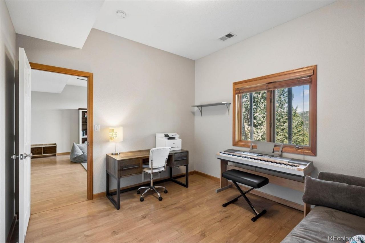 Panoramic mountain vistas featuring Mt. Blue Sky define this exceptional 4-bedroom, 2,904 square foot luxuryhome set on 1.65 private acres with a flat, easily accessible driveway in the sought-afterCragmont Estates neighborhood of Evergreen. Perfectly situated to capture nearly 180degree Rocky Mountain views, the property offers a rare blend of privacy, usability, &iconic Colorado scenery, framed by dramatic rock outcroppings. The inviting great room features soaring two-story windows that flood the space with natural light while showcasing the breathtaking landscape. Tongue-and-groove vaultedceilings, rich wood floors, and a cozy fireplace create a warm yet striking focal point.The open-concept layout flows seamlessly into a well-appointed kitchen with granite countertops, stainless steel appliances, a gas cooktop, ample freshlypainted cabinetry, and a breakfast bar. The adjacent dining area is ideal for gatherings and opens directly to an expansivewraparound deck, creating effortless indoor-outdoor living and the perfect setting to takein the sweeping views.The upper-level primary suite is a true retreat, occupying its own private level andcapturing the homes most dramatic vantage point. It features panoramic views, aspacious walk-in closet with new built-in shelves and drawers, and a luxurious five-piece bath designed for comfort andrelaxation. The main level offers two additional bedrooms and a full bath, providingflexibility for guests, family, or workspace. The finished lower level expands the homes versatility with a generous family roomfeaturing a pellet stove, an additional bedroom and bathroom, and a dedicated office orfitness area?ideal for todays lifestyle needs.Additional highlights include a level recreational area and dog run, new furnace, new/advanced septic, and thoughtfully designed outdoor living spacesthat enhance the quintessential Colorado mountain lifestyle in this exceptionalEvergreen property.