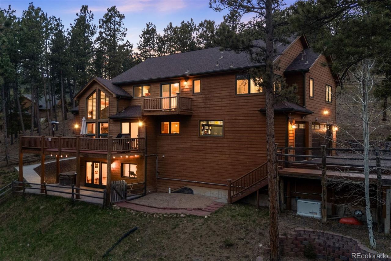Thoughtfully upgraded for peace of mind and efficiency this home has a whole-home Generac backup automatic generator, Defensible Space mitigation (May 2024, certified to 200 for insurance), new furnaces (2023), A/C (2023), roof (2019), garage doors (2024), driveway repaving (2024), Tesla EV charger, re-screened windows (2024) and full interior repaint (2024). Youll feel the peace and privacy this property offers sitting on a quiet and private 2.48-acre cul-de-sac lot in the highly sought-after Aspen Meadows neighborhood. The kitchen has been fully reimagined in 2024 with quartz countertops, Bosch appliances, refaced cabinetry, brick backsplash, and a Titan beverage cooler, perfect for entertaining or quiet nights at home. A state-of-the-art theater room, complete with a 110 screen and Denon AV system (2025), creates the ultimate movie-night experience. Find exceptional flexibility on the lower level with a full in-law suite, kitchenette, bedroom, bath, and walk-out access to a covered patio and hot tub, and a fully wheelchair-accessible via ramp and step-free entry, ideal for multigenerational living or guests. Glide up the mountain contemporary staircase to an airy loft that overlooks soaring vaulted ceilings, expansive windows, and the open-concept main living space. The beautifully refreshed primary suite features a private balcony, updated spa-inspired bath with in-floor radiant heat, walk-in shower, dual vanities, and a soaking tub perfectly positioned to take in the views. Soak in the Strong Spas hot tub (2023) as snow falls through the trees, or relax on the expansive trex deck with incredible mountain views in the distance. Just minutes from Evergreen and Conifer, youre close to everyday conveniences while still feeling completely removed from it all. RV parking plus space for 8 vehicles and LED lighting throughout. Maxwell Falls trailhead is 1.5 miles away. Evergreen and Conifer are both minutes from your door for dining, shopping, and schools.