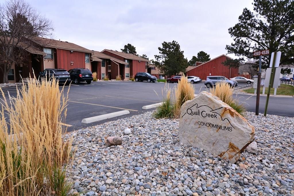Amazing ground-level condominium in a quiet, tucked-away location at the rear of Quail Creek Condominiums on Picturesque Circle. A private, recently updated entrance welcomes you into a spacious great room filled with natural light and serene views of mature, shaded trees. This 2-bedroom, 1-bath home features a well-maintained kitchen and luxury wood flooring throughout, along with a professionally painted interior. Recent upgrades include a brand-new refrigerator, dishwasher, stove, LG all-in-one WiFi washer/dryer combo, LG in-wall air conditioner, kitchen faucet, white wood plantation shutters, energy-efficient triple-pane windows, and sliding storm doors. Enjoy relaxing mornings or evenings on the covered rear patio, accessible from both the living room and primary bedroom. Stay comfortable year round with efficient hydronic baseboard heating and ceiling fans. Additional highlights include ample outdoor storage, two permitted parking spaces, and a recently repaved parking lot. The community offers convenient access to a heated pool, secure mailbox area, and trash facilities, with exterior painting scheduled for next year. Ideally located near the Powers Corridor and Peterson Air Force Base, with nearby schools including Penrose Elementary, Sabin Middle, and Doherty High School. HOA dues cover pool access, trash, snow removal, lawn care, security monitoring, pest control, and exterior maintenance