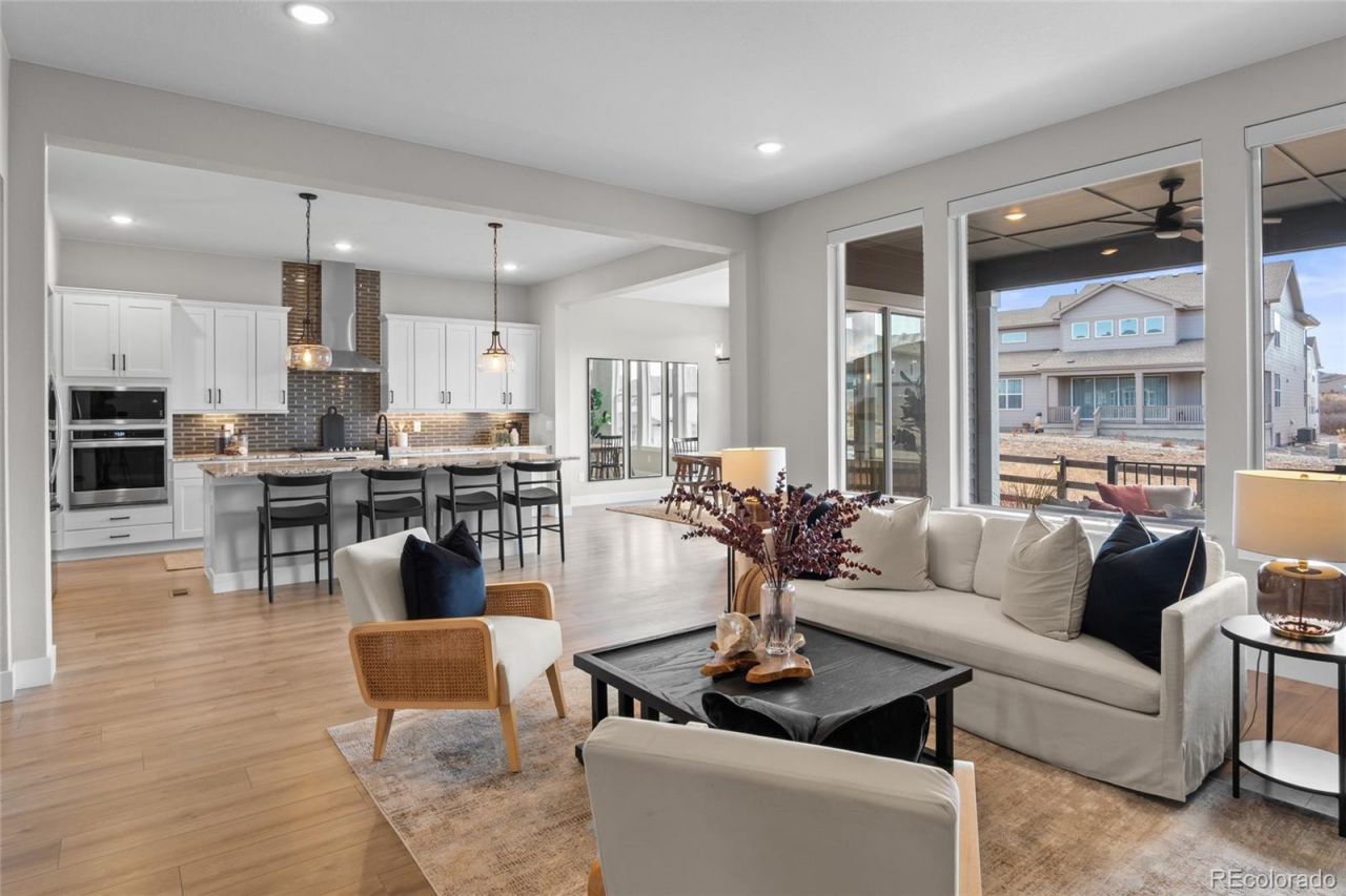 Nestled in the picturesque bluffs of Castle Rocks Montaine community, this impeccably maintained and light-filled ranch home is just steps away from the communal amenities, and minutes from Colorados finest hiking/biking trails and the quaint shops and restaurants of historic downtown Castle Rock! Offering multiple areas for gathering and entertaining, this elevated Brightland home built in 2023 has been upgraded far beyond the competition, featuring a well appointed luxury kitchen with a sizable quartz island that seats 6, 42 cabinetry with crown molding and soft-close doors, pull out drawers, and a separate prep kitchen area with a large pantry, prep sink, and second dishwasher. The Primary suite is light, bright, and spacious, and the enormous closet, which connects directly to the laundry room (washer, dryer, and cabinetry included!) has room for an accessory island or ottoman. The Primary bath has a step in shower, and is equipped with grab bars. The secondary bedrooms are connected with a Jack and Jill full bath, and a separate powder room upon entry completes the main floor living space. The finished basement features 9 foot ceilings and a huge family room (plumbed for a wet bar), another spacious bedroom with walk-in closet, 3/4 bath, an additional fully shelved walk-in closet, and tons of unfinished square footage to re-imagine as your own unique space! Recent upgrades include several custom Hunter Douglas remote blinds (operational from your phone!), designer lighting, fully finished garages with painted drywall and epoxy floors, custom window well covers, and a fresh exterior paint job. The home backs to a green belt, with the front yard featuring gorgeous xeriscaping with irrigated plantings, showcasing the curb appeal of this one of a kind, low maintenance home. The covered back porch includes a ceiling fan and mount for an outside TV, and flows into a lush sprinkler-equipped back yard. Why buy new when you can have all of these next-level extras?!