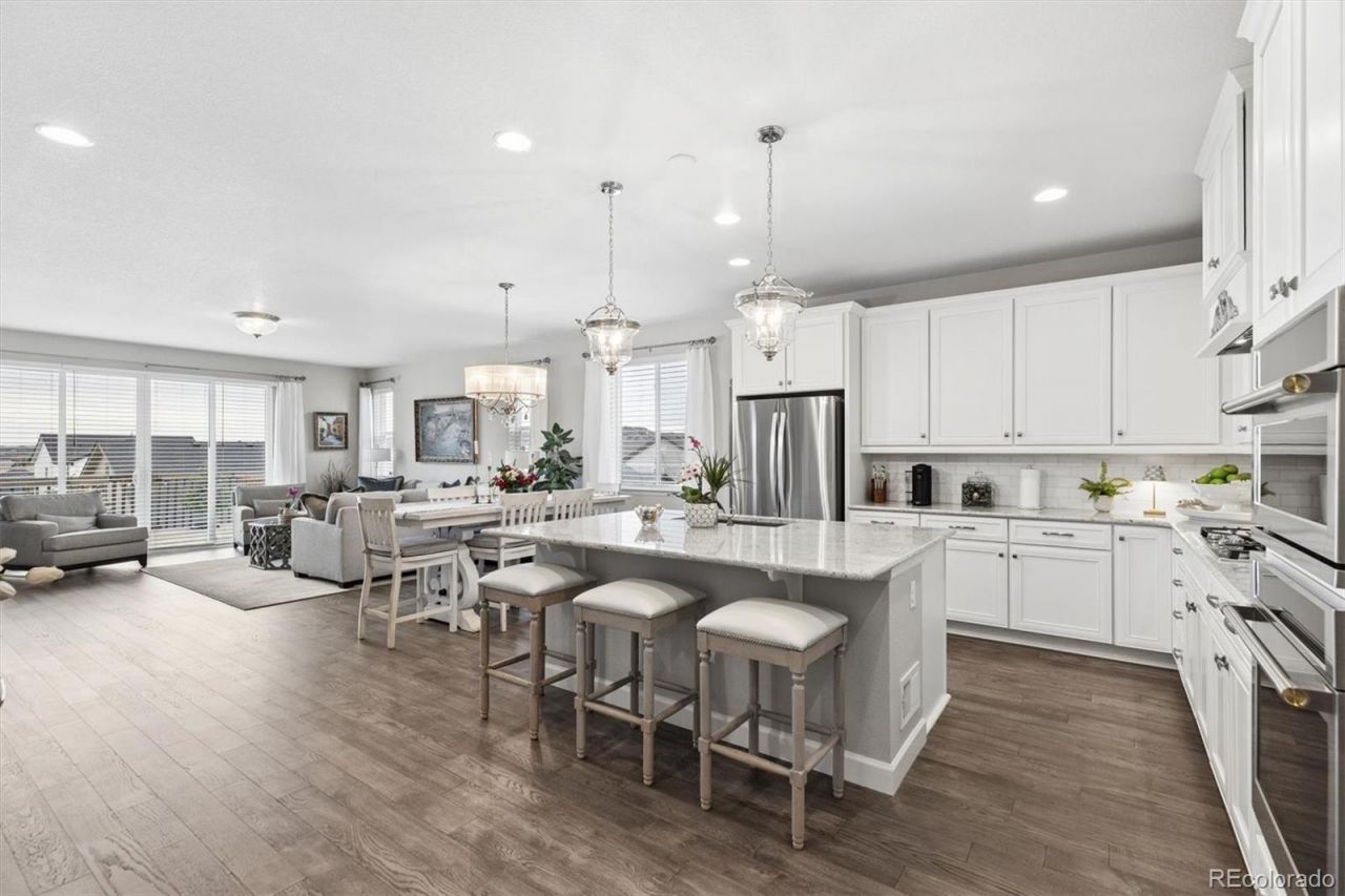 Cobblestone Ranch | 5 Bed | 3 Full BathExceptionally Rare: two kitchens, two living spaces, one beautiful property. Impeccably maintained and truly move-in ready, this home lives like a model. The main level offers an open great room, dining space, and beautifully appointed kitchen with center island and walk-in pantry. The privately situated primary suite features elevated lighting, detailed trim work, a walk-in closet, and a luxe shower?designed as a true retreat. Functional details matter: upstairs dedicated mudroom, laundry with added storage, and thoughtful organization throughout. Lower level with full private living quarters?complete with full kitchen, spacious great room, two bedrooms, full bath, office area, washer/dryer, and separate entrance. Ideal for multigen living, extended guests, or long-term flexibility. Outdoor living is seamless with a full-length deck and expansive concrete patio below. The backyard blends low-maintenance xeriscape gardens with a generous grassy play area and sandbox space. 3-car garage. Designer finishes. Flexibility. Turn-key condition.