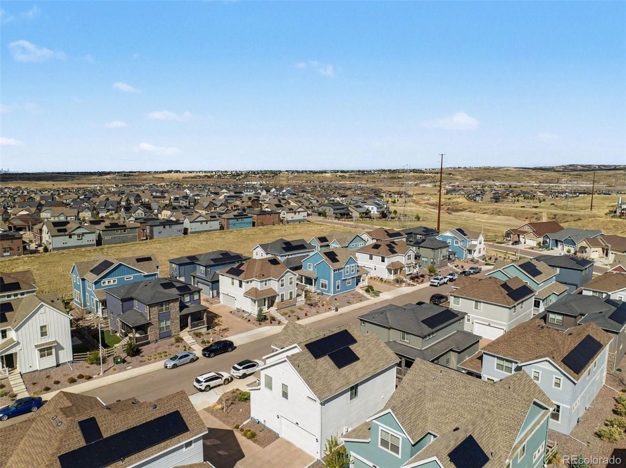 Beautifully maintained and thoughtfully designed! This modern farmhouse-style home blends timeless appeal with todays most desirable features, and its only 5 years old. Tucked on a quieter side street in the highly sought-after Sterling Ranch community, youre just steps from parks, trails, open space, and resort-style amenities. Inside, the open-concept layout is filled with natural light and designed for both everyday living and effortless entertaining. The bright gourmet kitchen shines with stainless steel appliances, natural stone countertops, and ample space to gather and create. Step outside to your PRIVATE DECK ?perfect for soaking up Colorado sunshine during a relaxing afternoon or evening happy hour?overlooking a RARE, MORE SPACIOUS SIDE YARD that offers added breathing room and privacy compared to neighboring homes. With plenty of potential to be fenced and landscaped, its ideal for dogs, play, or creating your own outdoor retreat. Upstairs, the expansive PRIMARY SUITE offers a true sanctuary?generously sized with room for a sitting area or workspace, and complemented by an impressive, boutique-style WALK-IN CLOSET designed for both function and style, offering exceptional storage and organization. Two additional bedrooms, a full Jack-and-Jill bath, and convenient laundry complete the upper level. Enjoy LOW-MAINTENANCE, lock-and-leave living with the added benefit of an OWNED SOLAR SYSTEM to help offset energy costs. Located within the highly regarded Douglas County School District, with a new elementary school underway and nearby charter school options, this home offers both comfort and convenience. Sterling Ranch is one of Littletons premier master-planned communities, offering miles of scenic trails, parks, and open space, along with a growing lineup of amenities including a pool, clubhouse, fitness center, pickleball courts, climbing wall and more. And dont forget Chatfield Reservoir, Waterton Canyon & Roxborough State Park down the road...