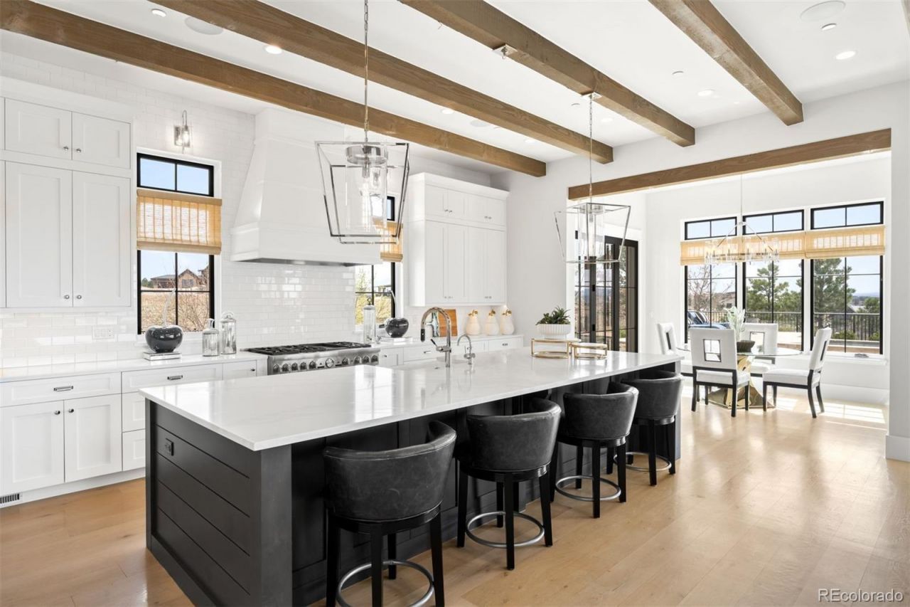 Framed by sweeping, unobstructed vistas of Pikes Peak, the rugged grandeur of the Rocky Mountains, & set w/in the prestigious Colorado Golf Club, this exceptional estate captures the very essence of Colorado living. Expansive walls of glass draw outdoors inward, filling the home w/ natural light. The great room is nothing short of breathtaking, w/ soaring 22ft ceilings, rich exposed wood beams, & a dramatic fireplace. 2 expansive folding glass walls open seamlessly to a covered terrace, creating a fluid indoor-outdoor living experience designed for both intimate moments & entertaining. At the heart of the home, the chefs kitchen is as functional as it is beautiful, anchored by a substantial Quartzite island & equipped w/ premium Thermador® appliances. A sunlit dining nook overlooks the tranquil pool, while a spacious walk-in pantry & butlers pantry add convenience. The main floor primary suite offers a serene retreat, complete w/ a warm stone fireplace, private access to outdoor living spaces, spa-inspired bath designed for indulgence, & a custom walk-in closet connected to the laundry room. Upstairs, 3 generously sized en-suite bedrooms provide elevated comfort & style. Function meets style in the spacious mudroom, thoughtfully designed to support the rhythm of daily life. The walk-out basement expands the homes versatility w/ a refined recreation room, complete w/ a sophisticated wet bar, game areas, & abundant storage. Complementing the main residence is a beautifully appointed, light-filled guest house designed for main-level living. Featuring a full kitchen, bedroom, bathroom, private garage, it offers an ideal space for guests or extended family delivering privacy w/o compromising on luxury. Outdoors, a true resort-style sanctuary unfolds. The saltwater pool glistens beneath open skies, surrounded by expansive lounging terraces, a rejuvenating spa, & a welcoming fire feature all perfectly positioned to take in the breathtaking mountain scenery.