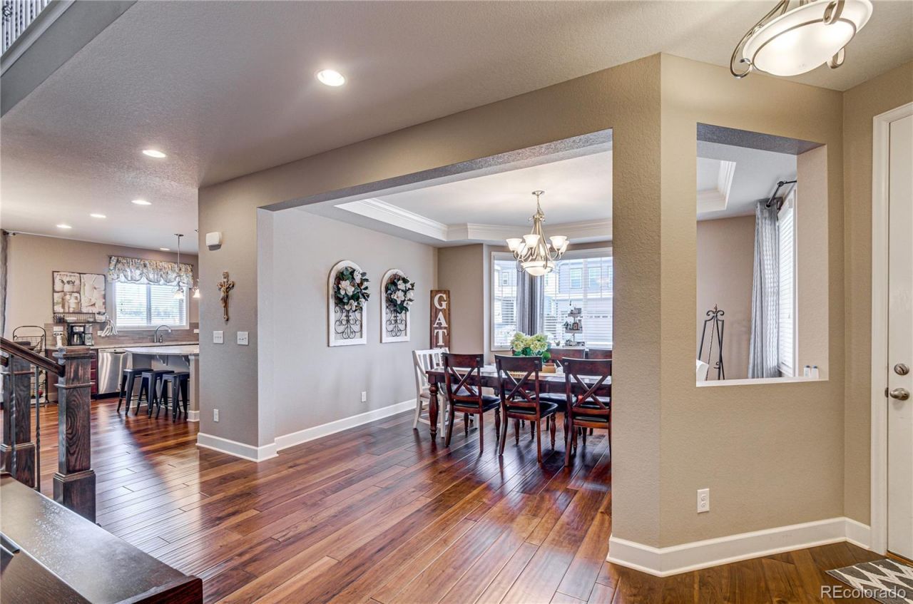 Gorgeous 5 bedroom 4 bath Richmond home in Peoria Place at Meridian. This 2 story home has over 4500 sf (3122 sf finished) and features beautiful wood plank flooring throughout the main floor, a chefs kitchen with large island, upgraded 42 cabinets, beautiful granite counter tops and tile back splash, stainless double ovens, gas cook top and refrigerator that opens to the spacious dining area and family room with fireplace. Enjoy the bright and open formal dining room with coffered ceiling. Main floor study/bedroom with built in floor to ceiling bookcase. The second floor features a large bright loft, laundry room with washer and dryer, 4 bedrooms (one with its own full bath) full double vanity hallway bath, spacious primary suite with coffered ceiling, large walk-in closet, and luxurious 5 piece bath. Zero maintenance back yard with custom patio. Plenty of room for storage in the 1405 sf unfinished basement. 3 car garage is dry walled and insulated. Short commute to Lincoln light rail station, I-25, E-470, restaurants, Park Meadows Mall and Sky Ridge Hospital. Douglas county schools. 2 medium size dogs under 25 pounds allowed with additional pet deposit. No Roommates, No Smoking, No Cats. Good income and credit. Available June 1.
