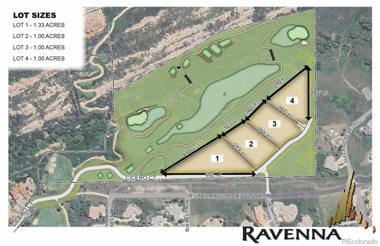 Here are four exclusive one-acre custom home lots now available at Ravenna Country Club, each offering an unparalleled blend of luxury, privacy, and breathtaking natural beauty. These premier homesites, backing to the fairways of holes 8 and 9, cater to discerning buyers seeking a rare opportunity to build their dream home in one of Colorados most prestigious gated golf communities.Ravenna is an approachable neighborhood for families and couples seeking a personalized country club living community surrounded by beautiful landscapes and quiet elegance. We contract some of the best architects and contractors in Colorado to bring to life an exquisite collection of custom homes and golf villas, or you can bring your own custom home builder. Residents can enjoy 24-hour security, private streets, calm evenings, and majestic views from every angle. Each custom residence is a masterfully crafted work of art with modern features blending with traditional and timeless elegance. You can join our all-rounded community just South of Chatfield Reservoir and nestled in the iconic red rocks of the Dakota Hogback, Waterton Canyon, and the South Platte River. Our gated community feels like a retreat offering outdoor adventures and entertainment while being close to the conveniences of downtown Denver, Park Meadows Mall, and the Denver Tech Center.